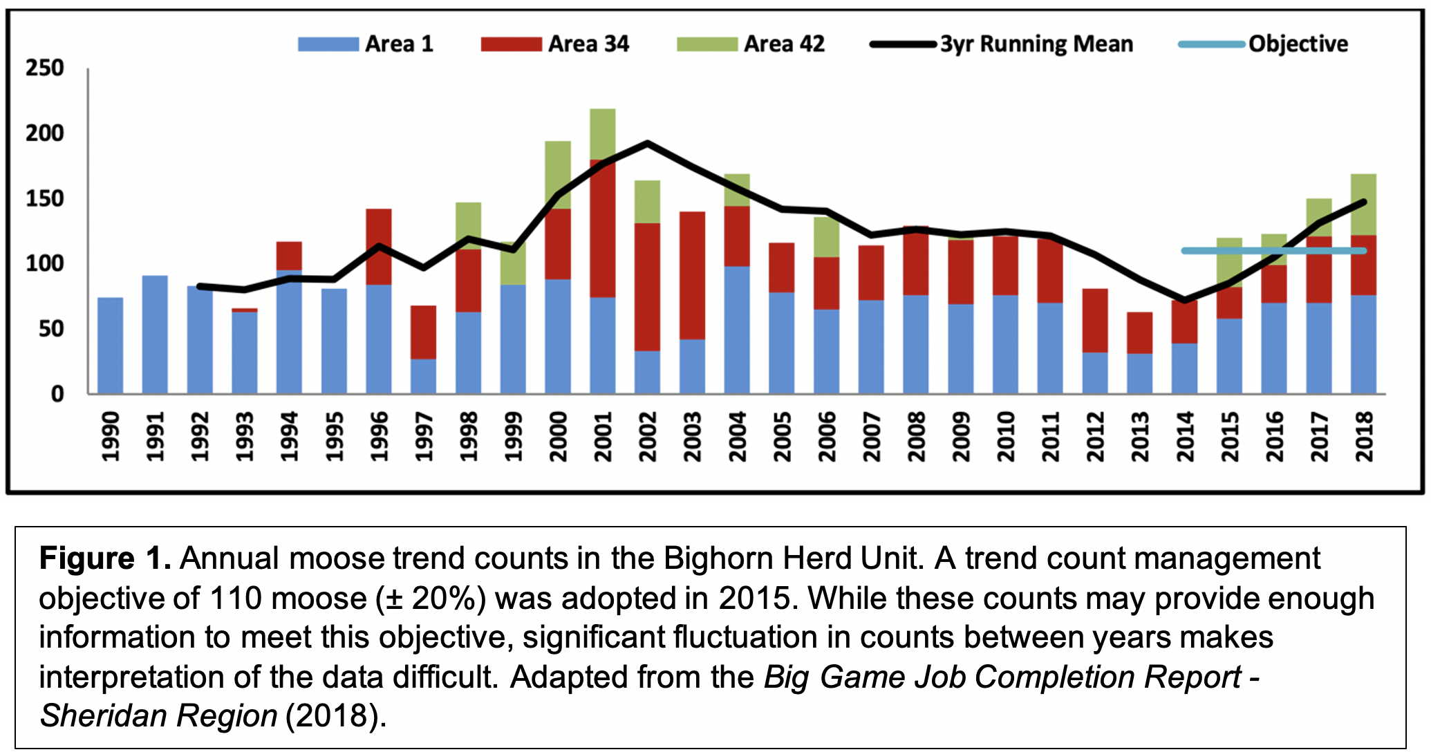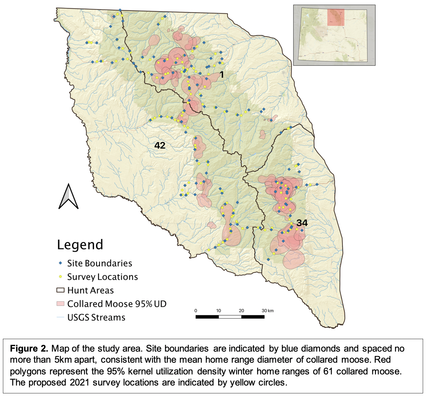 Many large herbivore populations in the Western U.S. are monitored via annual aerial surveys, during which a pilot and an observer (often these are the same person) obtain a minimum count of animals they saw during the flight. While minimum population counts can certainly be useful, they lack any measure of uncertainty and by definition underestimate the number of animals in a population. Moose in particular are typically associated with forests and riparian shrublands, the former of which are not conducive to aerial survey methods. Trees are very effective at “hiding” moose from these surveys, further contributing to their underrepresentation of real population sizes. Therefore, we must account for our inability to see every moose during our surveys to get more realistic estimates of population size.