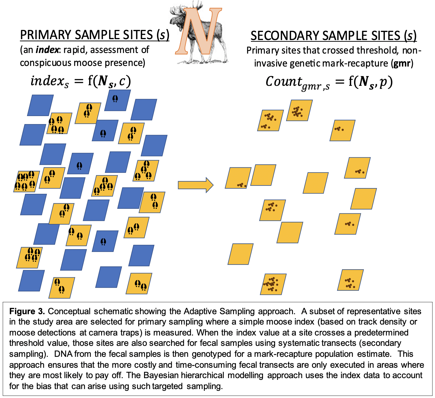 I will use the DNA found in scat and hair samples to identify individual moose and estimate their population size with a Spatial Capture-Recapture (SCR) model. Because all moose leave tracks in the snow, these too are useful indicators of abundance. Indeed, moose tracks are a telltale sign of where moose have been. Thus, by focusing genetic sampling in areas where tracks are present, we can obtain the maximum amount of samples (data) in the least amount of time. This approach is called Adaptive Sampling, a highly efficient approach by which observers are constantly adapting to changing field conditions to focus on areas with obvious signs of animal activity. There exists some relationship between the number of moose paths in the snow, the amount of scat and hair present in that area, and the number of moose that live there. I intend to integrate this wealth of information into an Adaptive SCR model to obtain a robust population estimate of moose in the Bighorn Herd.